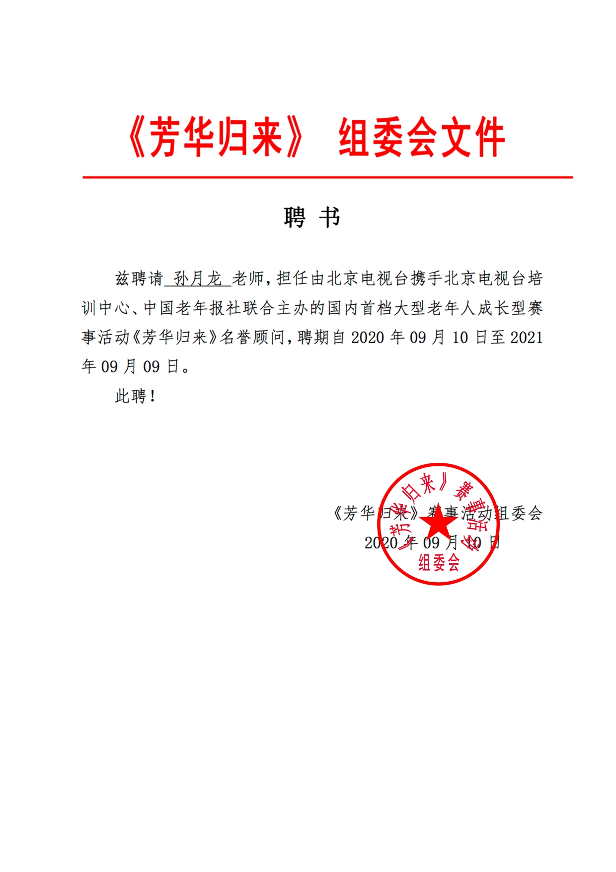 孙月龙担任北京电视台等联合主办《芳华归来》全国大赛名誉顾问