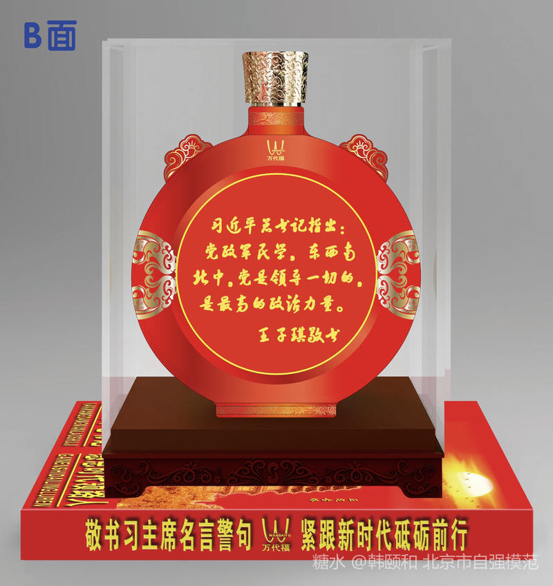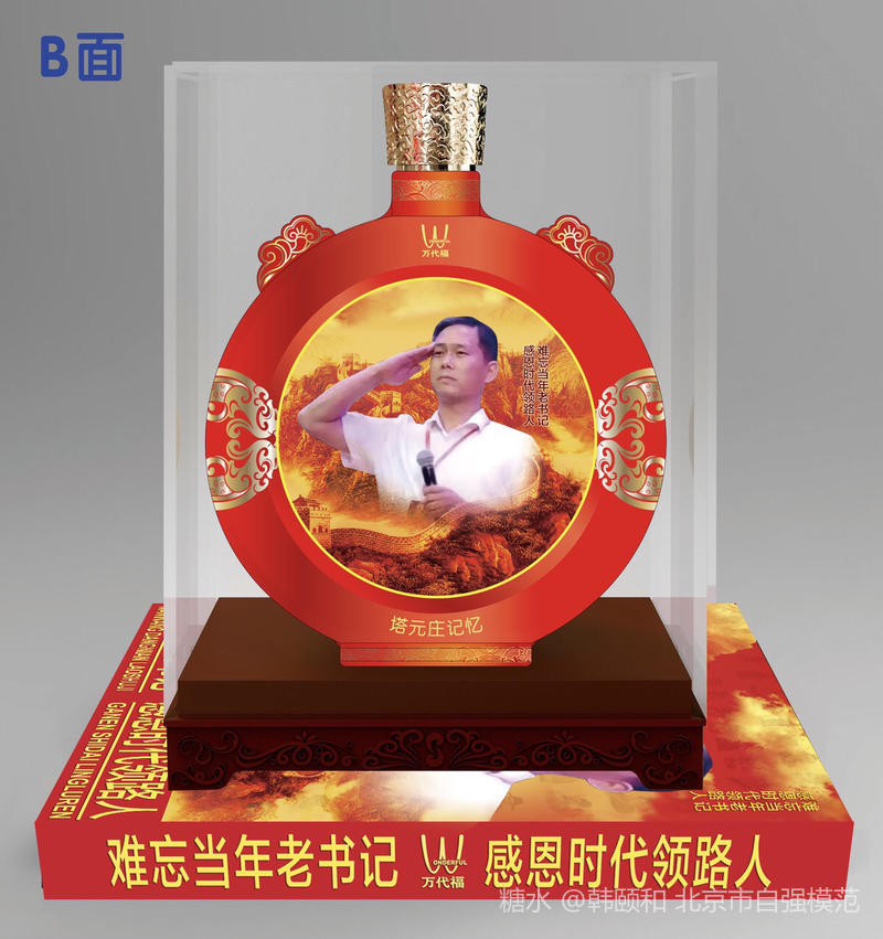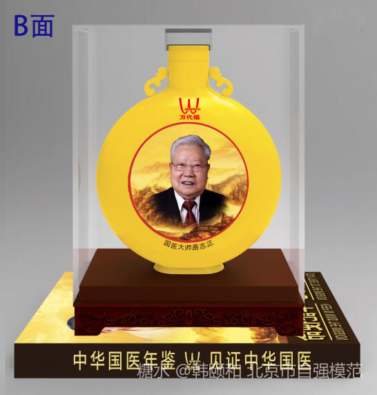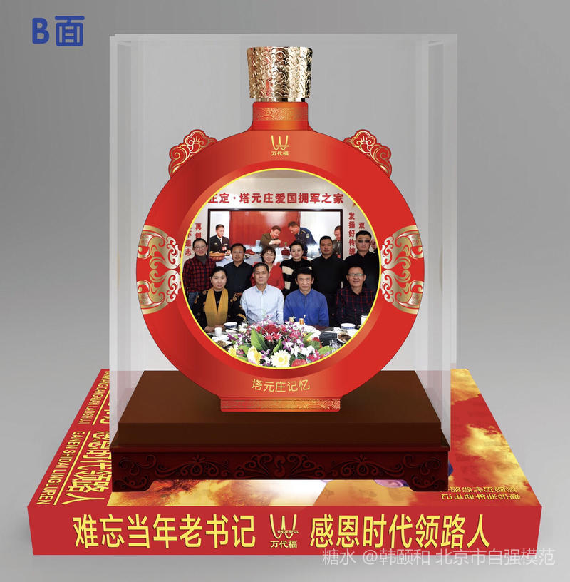“颐和包装”的“为正定喝彩”的系列纪念品,A面是艺术家或“私人订制者”的形象,B面是艺术家的作品或“私人订制者”敬书习主席的名言警句。器皿内是贵州大兴东酒业出品的3斤酱香老酒,包装内是一本介绍正定历史文化的书籍。