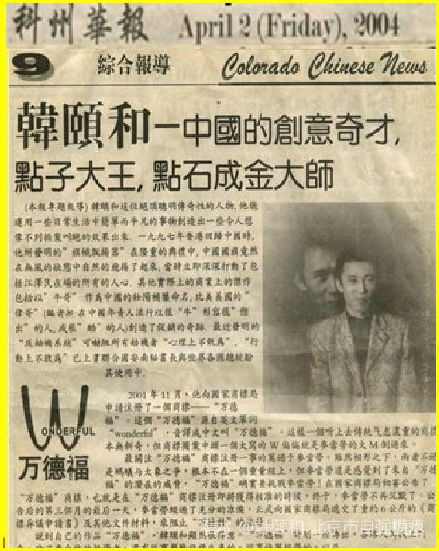 美国科罗拉多州华文报纸及美国50个州的中英文媒体报道:韩颐和—中国的创意奇才,点子大王,点石成金大师。