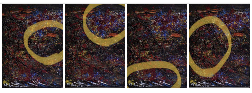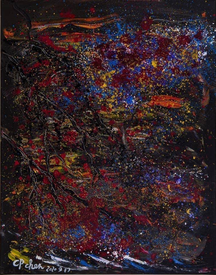 陈持平很自豪说,他画动物最传神的地方就是眼睛,他多年来读到喜欢的诗句他就连夜把它画出来,一起笔最重视的就是定位画眼睛,按照资深画家的说法,这是不按/牌理出牌,日前有感而发读到小学课本就有的唐朝张继「枫桥夜泊」的诗句,他就非常喜欢,他想像到张继眼睛他所看到的情景:乌啼伴着满天飞霜,江枫红叶动人,渔火闪闪发亮。江水波波,飞霜闪闪,渔火点点,这幅画就是画一个「愁」字。千愁万绪。月落乌啼,飞霜满天,江枫渔火,对愁难眠。一个旅人的感觉:「愁」,触景生情。月落,乌啼,霜天,江枫,渔火,千愁,陈持平在这幅全部画到了。一个千愁万緖的旅人游子心!月落,乌啼,霜天,江枫,渔火,千愁,加上诗情万绪。千千万万的小白点,小红点,小黄点,小蓝点。