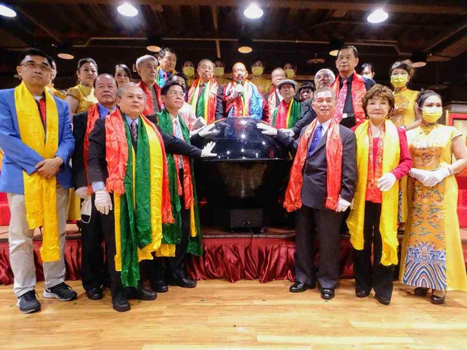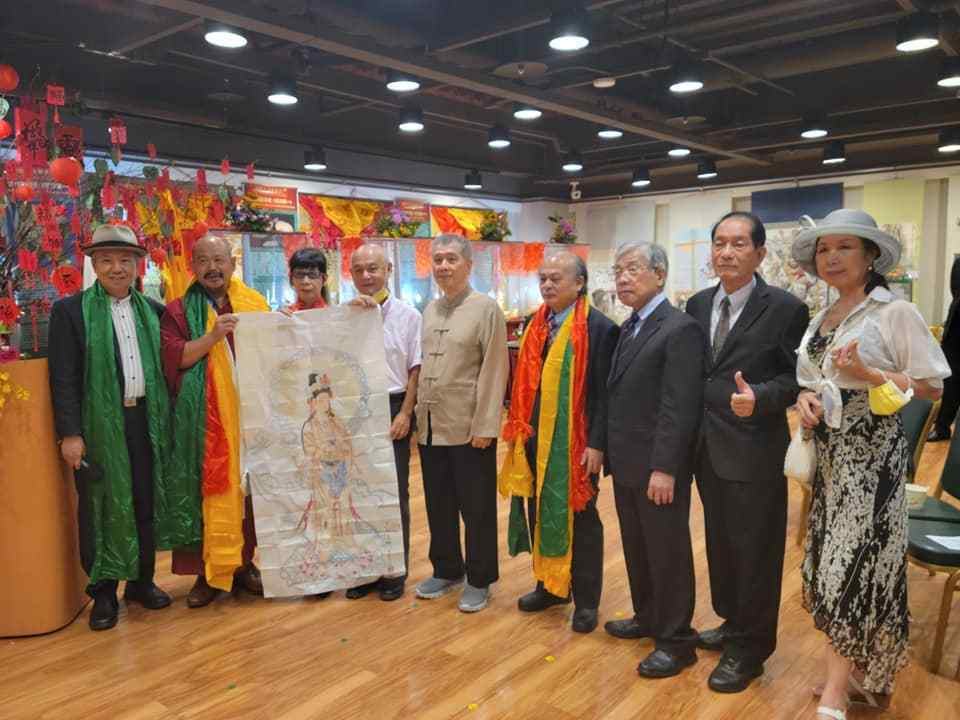 左起叶杰生理事长 、慧吉祥大活佛、李德珍大师、柯沛鸿社长(赠画见性成佛于慧吉祥大活佛)、知名艺术大师沉桢博士