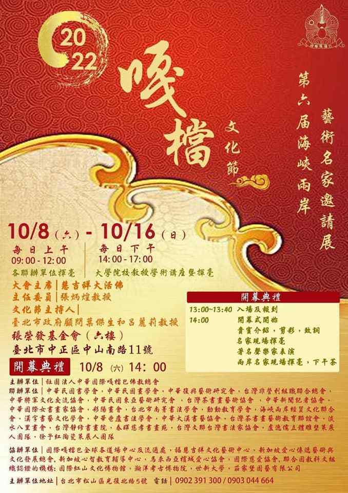 第六届嘎档文化节,2022 海峡两岸百位书画名家邀请展于2022年10月8日在台北市张荣发基金会盛大举行,主办单位总会长慧吉祥大活佛多年来在两岸间建立友好文化交流的平台,受到了两岸同宗同文中华文化界及艺术家们的好评,赢得了由衷的尊敬。