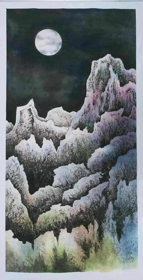 谢玉花的山水画自由地出入于传统与生活,既有扎实的基本功,又有创新的思维。其画作严谨细致,巧拙相生、灵动逼人,这多得益于其多次摆脱喧嚣与浮躁,远离闹市,登高探幽,涵养内心的结果。观其山川,铿锵有力的山体笔触与虚无缥缈的云烟形成强烈的对比,让我们耳目一新,如入清又静远之境。