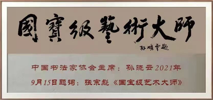 On September 17, 2021, Sun Xiaoyun, Chairman of the China Calligraphy Association, wrote an inscription to Zhang Zongbiao, "National Treasure Art Master".