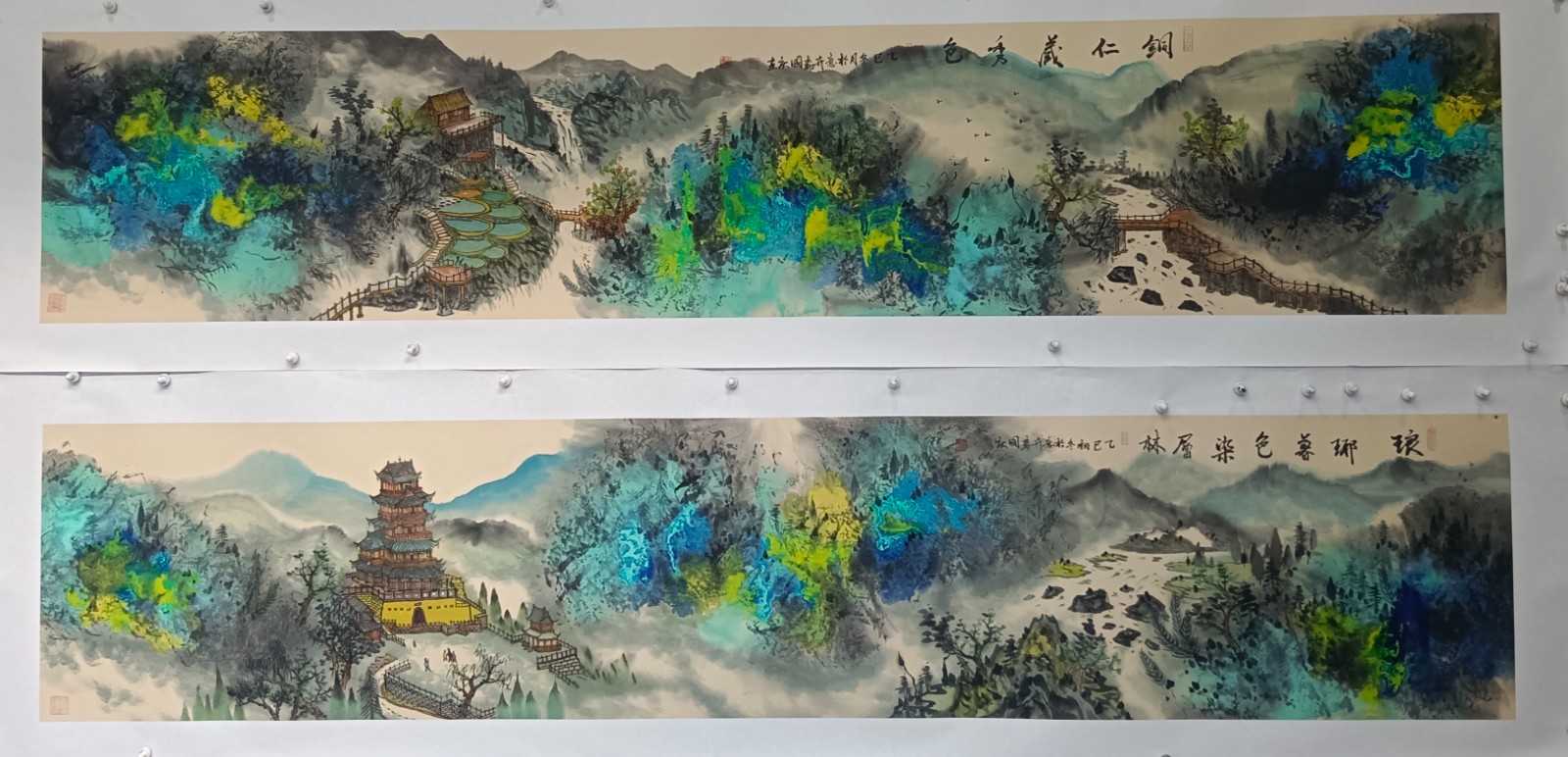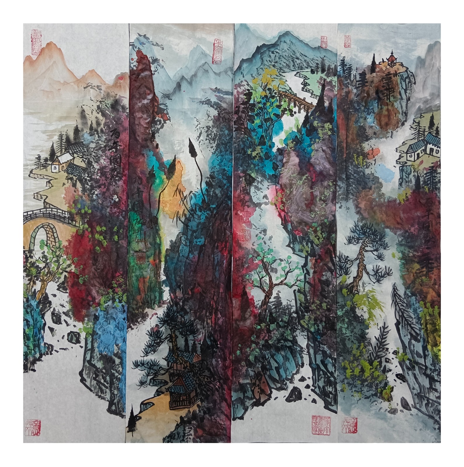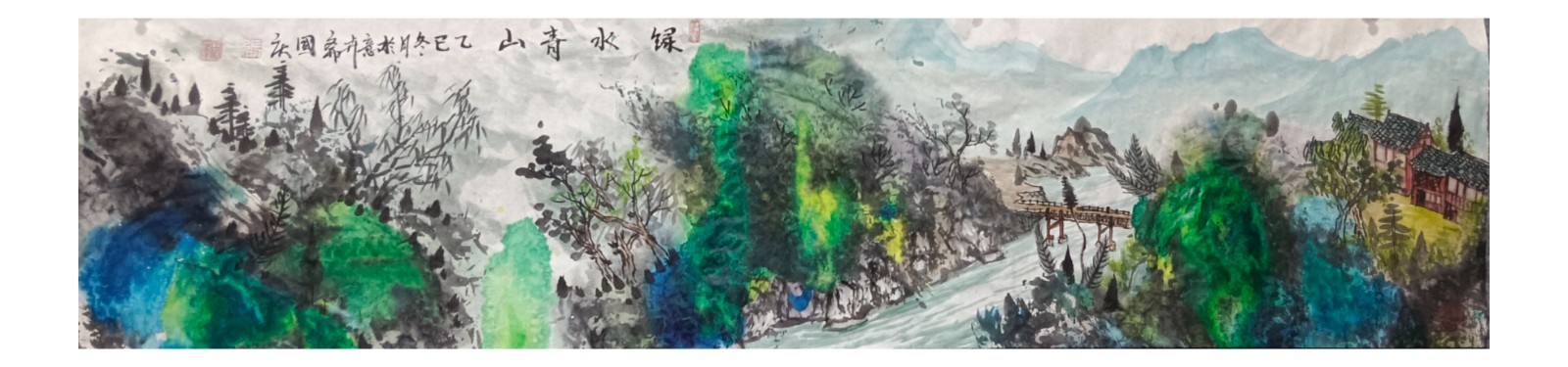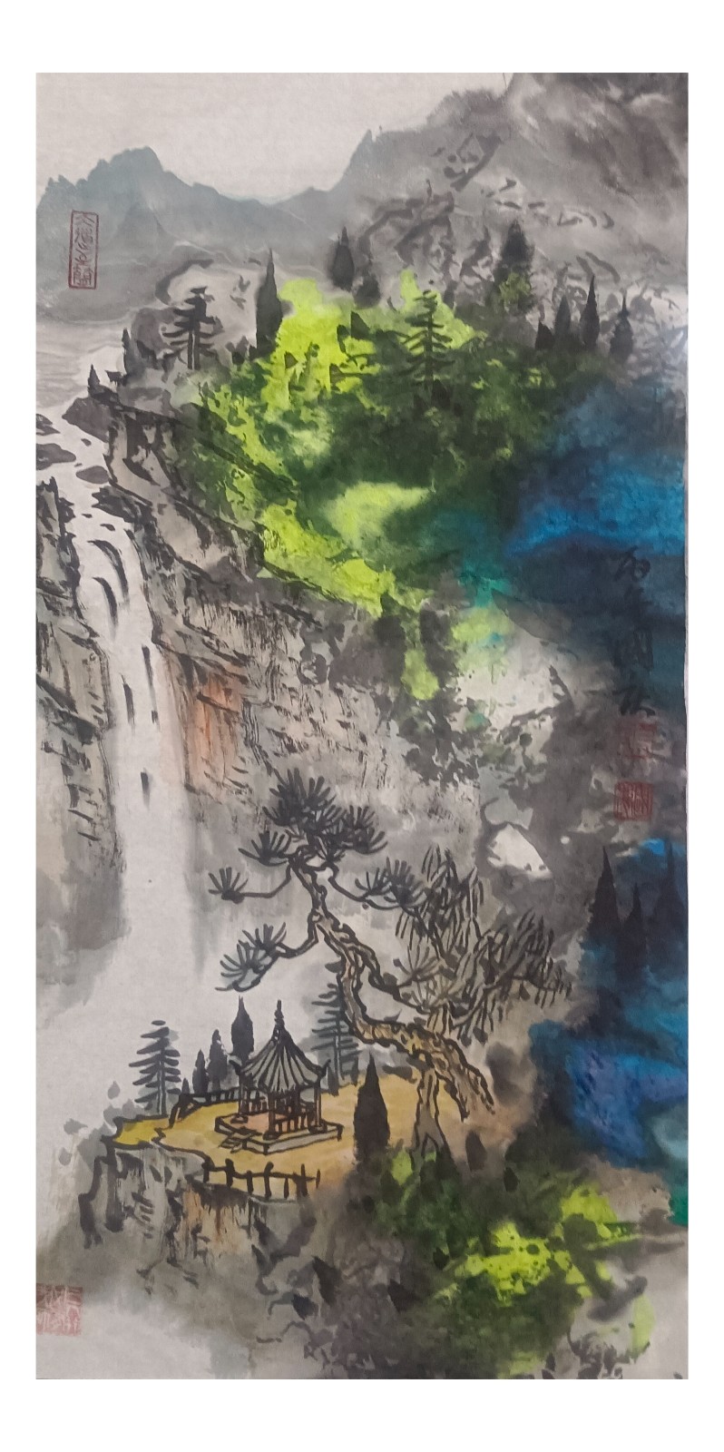 材料与技法的融合:在“赋彩”层面,幻彩山水结合金属颜料、水彩叠加等现代材料,并借鉴色彩构成原理(如色相、明度对比),在保留“色不碍墨,墨不碍色”传统原则的同时,创造出更具透明感、光泽感与视觉张力的色彩语言。