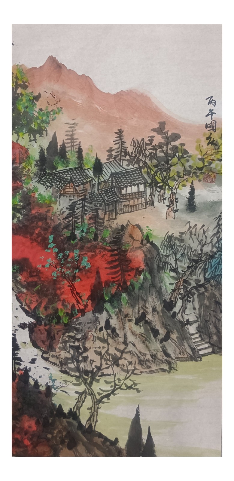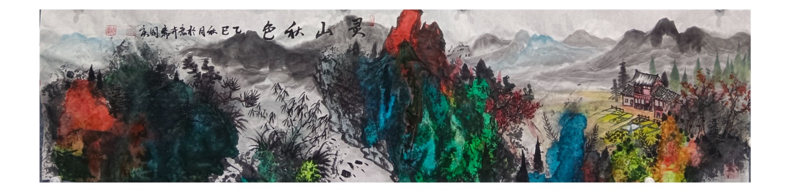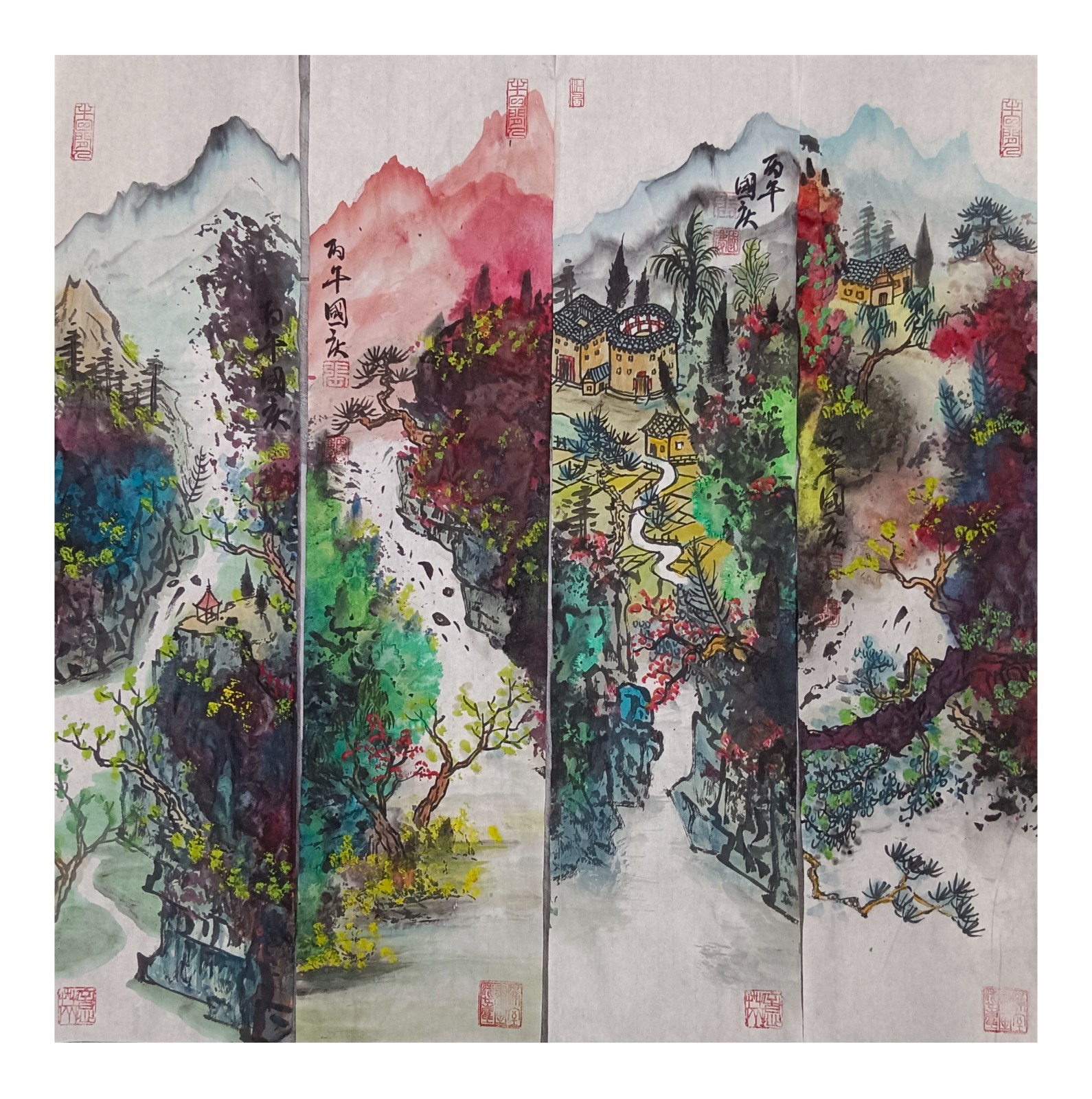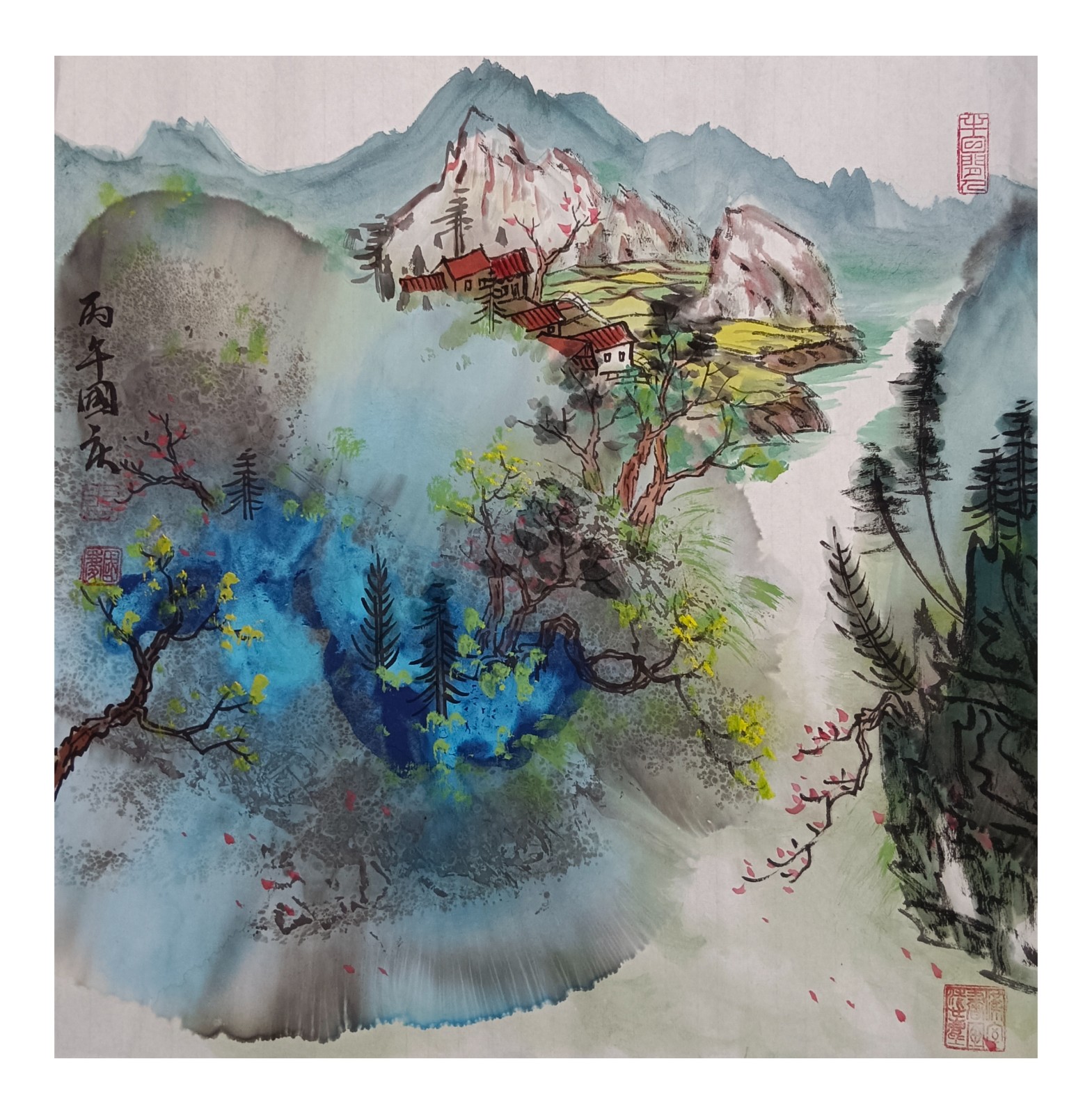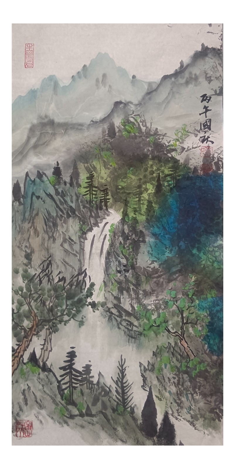 材料与技法的融合:在“赋彩”层面,幻彩山水结合金属颜料、水彩叠加等现代材料,并借鉴色彩构成原理(如色相、明度对比),在保留“色不碍墨,墨不碍色”传统原则的同时,创造出更具透明感、光泽感与视觉张力的色彩语言。