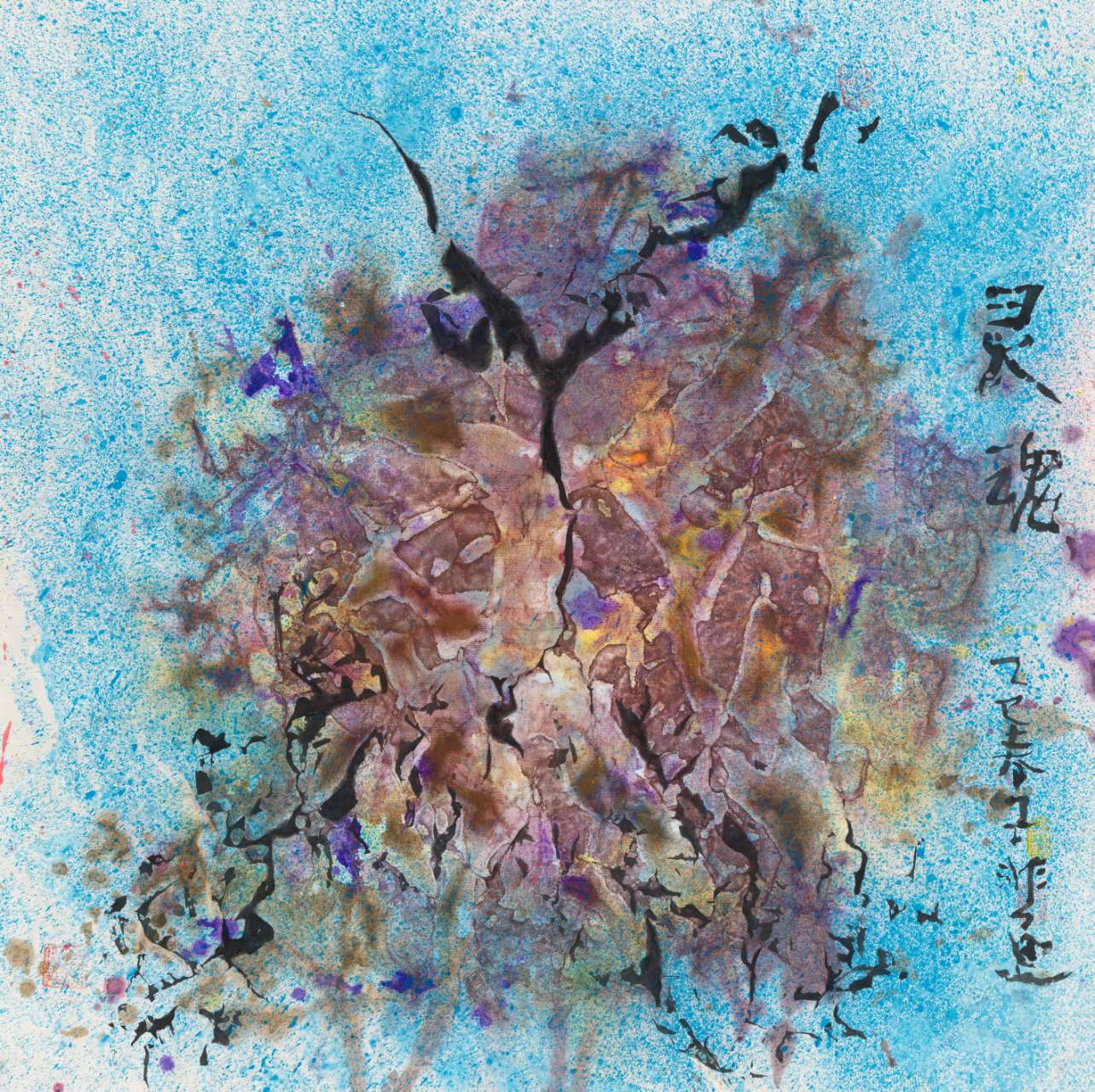 作品以平面化空间打破“三远法”程式,淡紫、粉蓝等现代色彩与焦墨山石形成强烈对比,营造虚实相生、气韵流动的视觉意境。题款文字与画面视觉元素深度呼应,成为构图有机部分,传递道家“万物有道”哲思,将宇宙观引入山水创作,拓展国画精神维度。