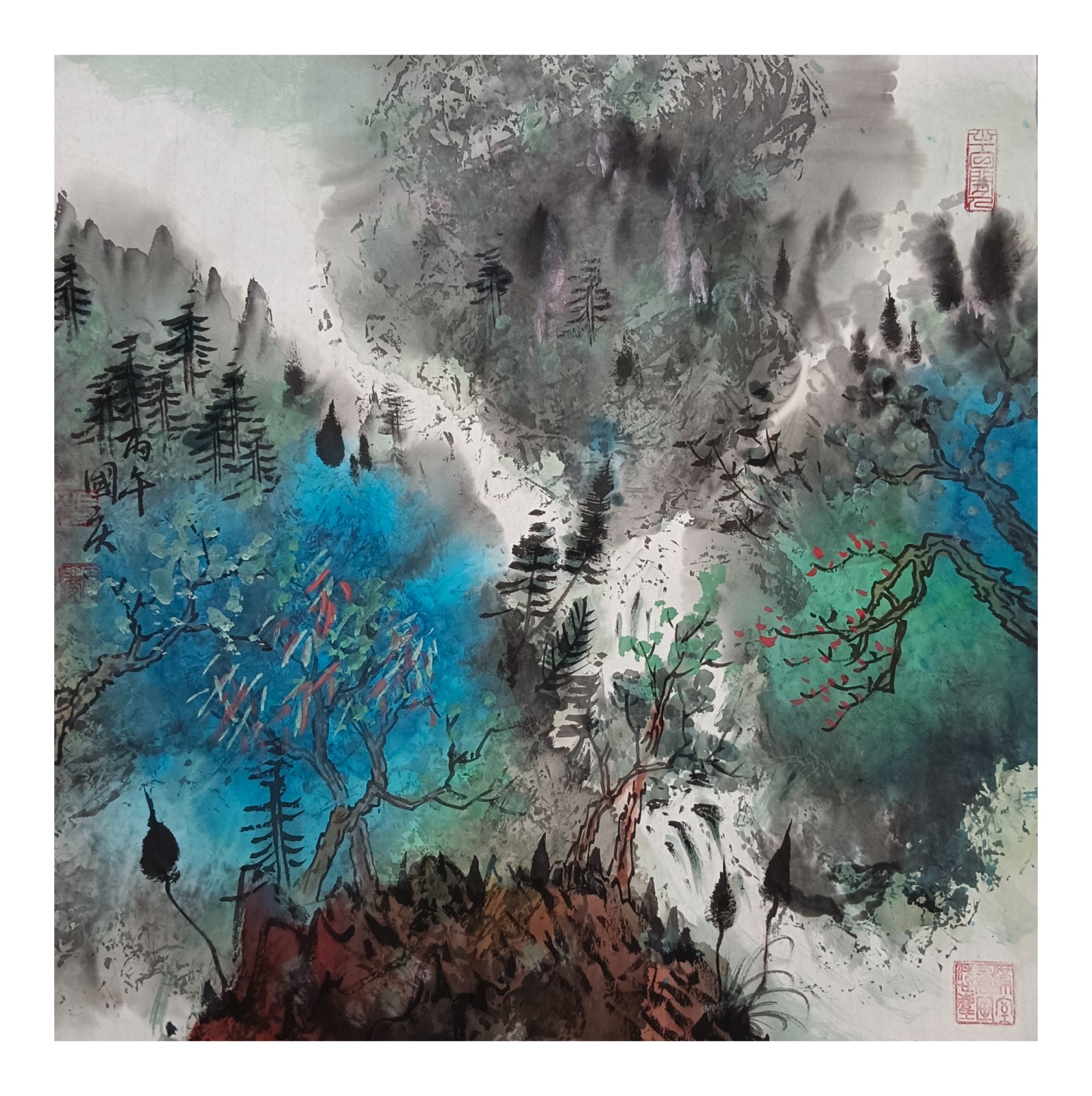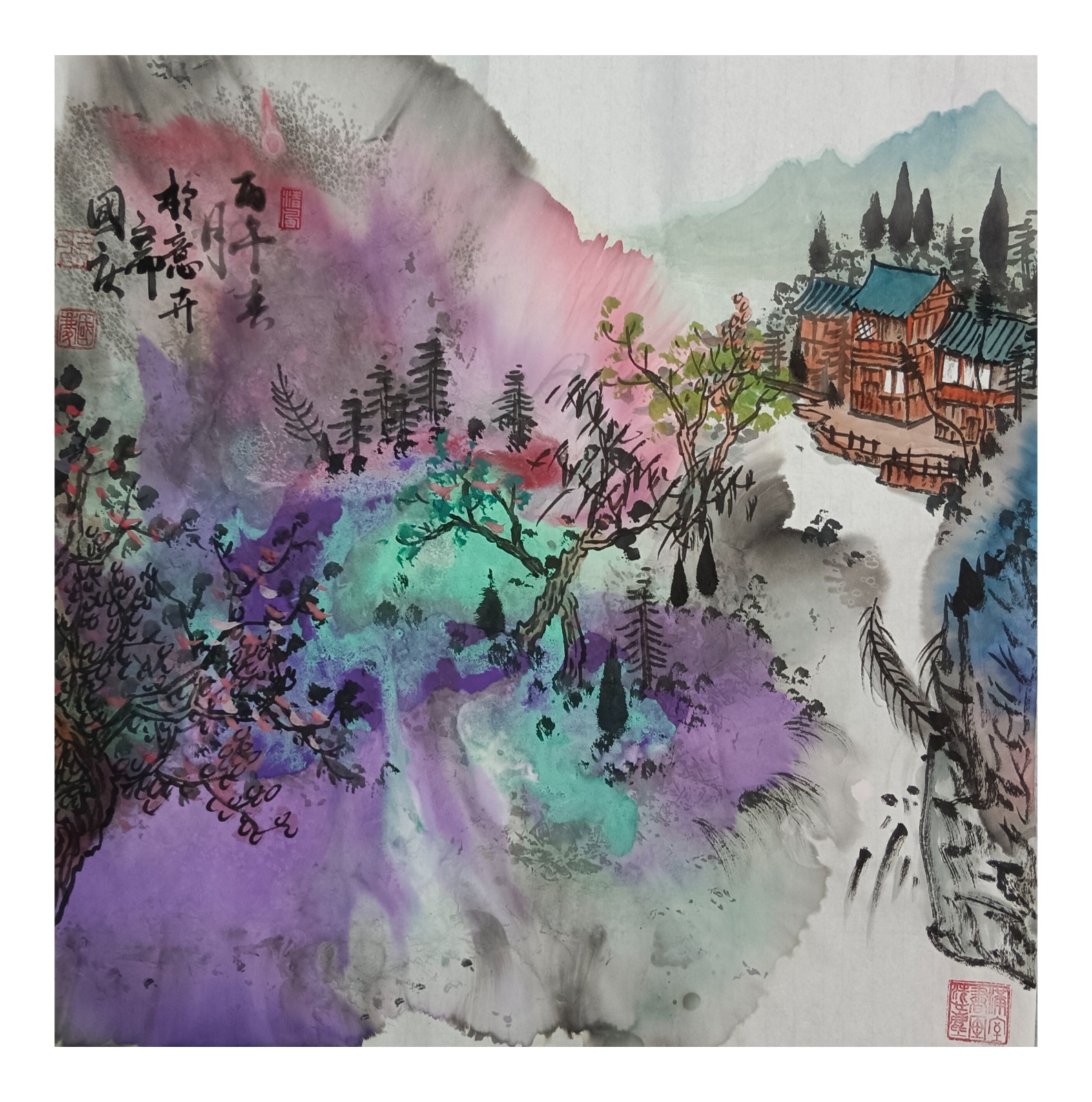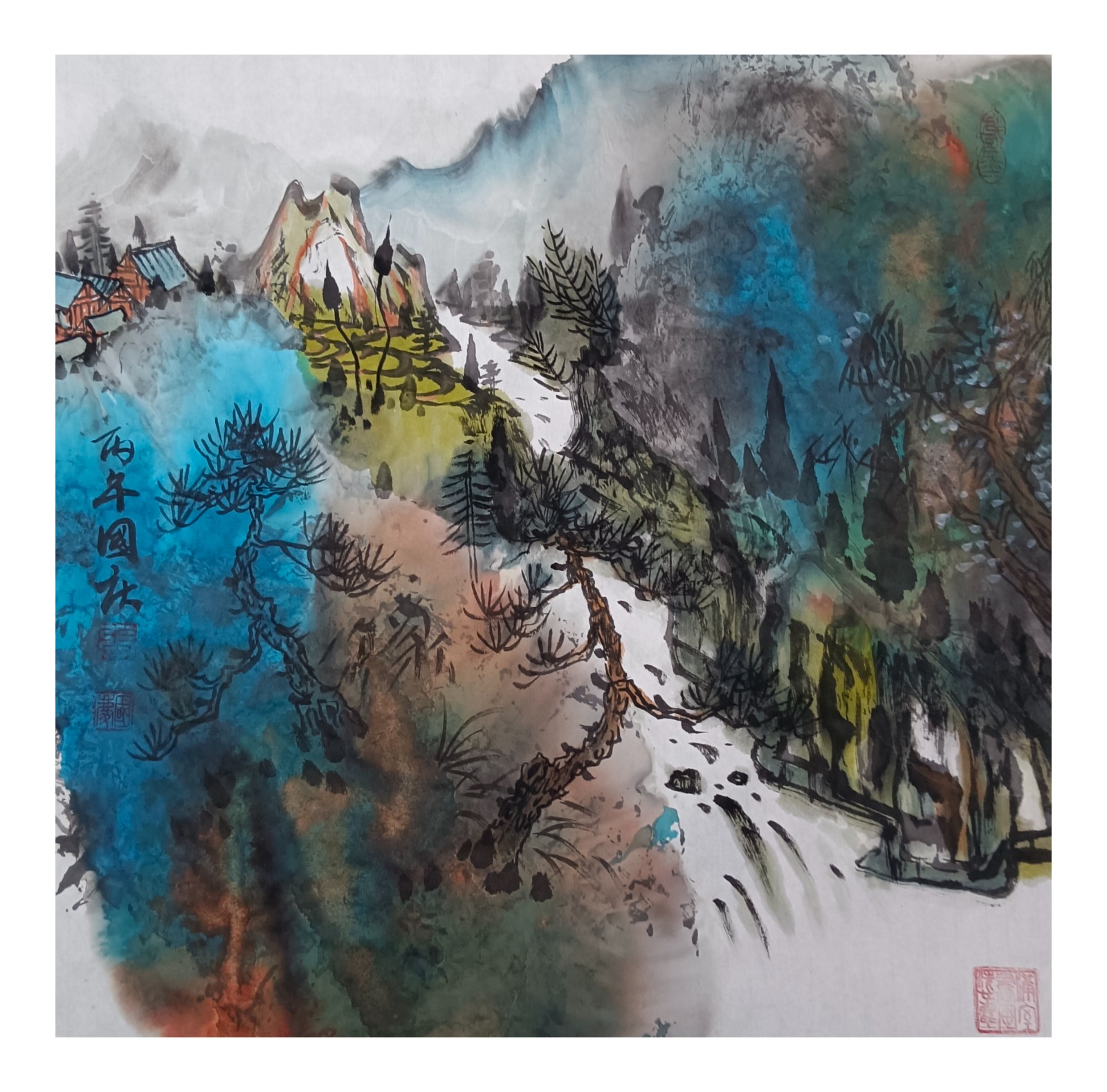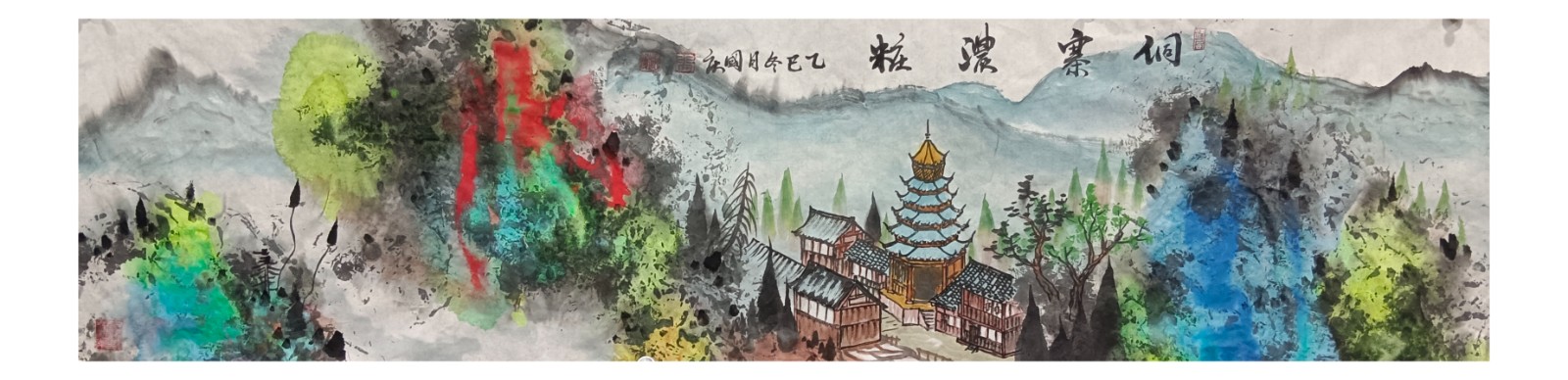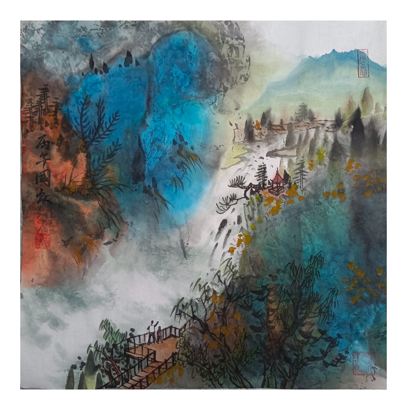 材料与技法的融合:在“赋彩”层面,幻彩山水结合金属颜料、水彩叠加等现代材料,并借鉴色彩构成原理(如色相、明度对比),在保留“色不碍墨,墨不碍色”传统原则的同时,创造出更具透明感、光泽感与视觉张力的色彩语言。