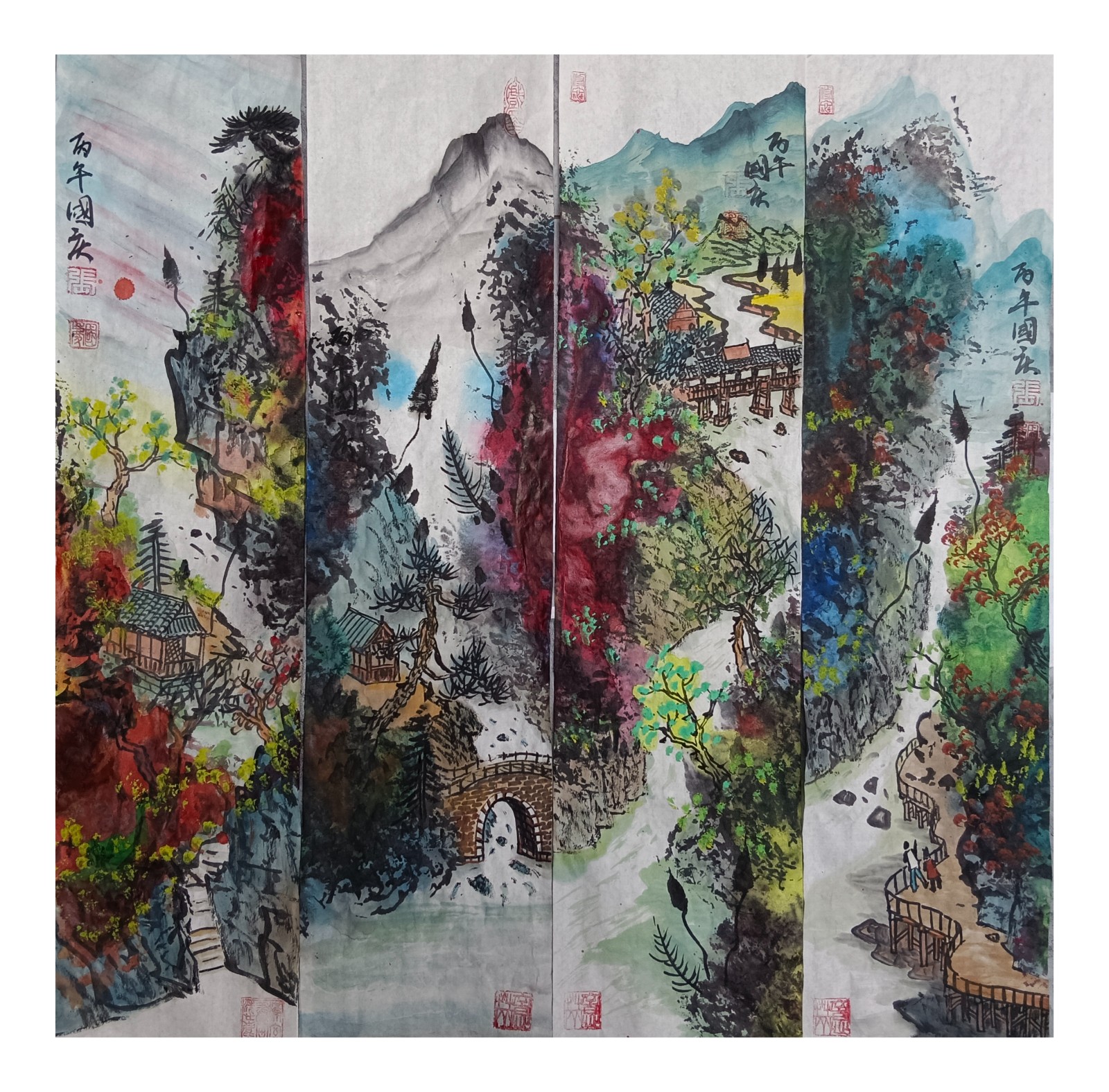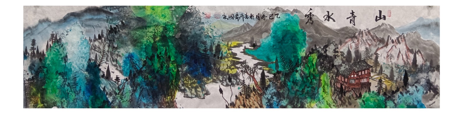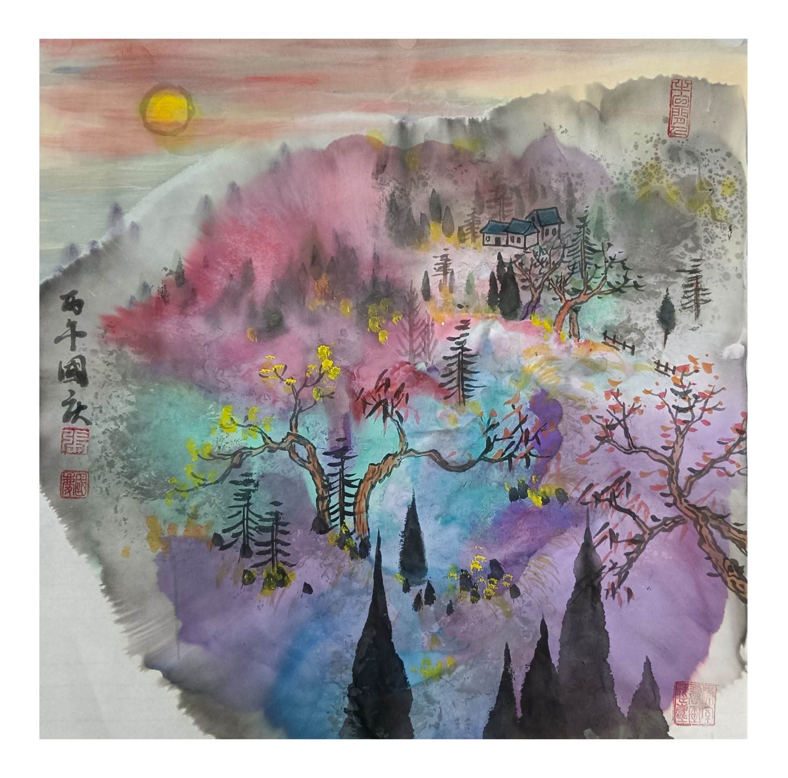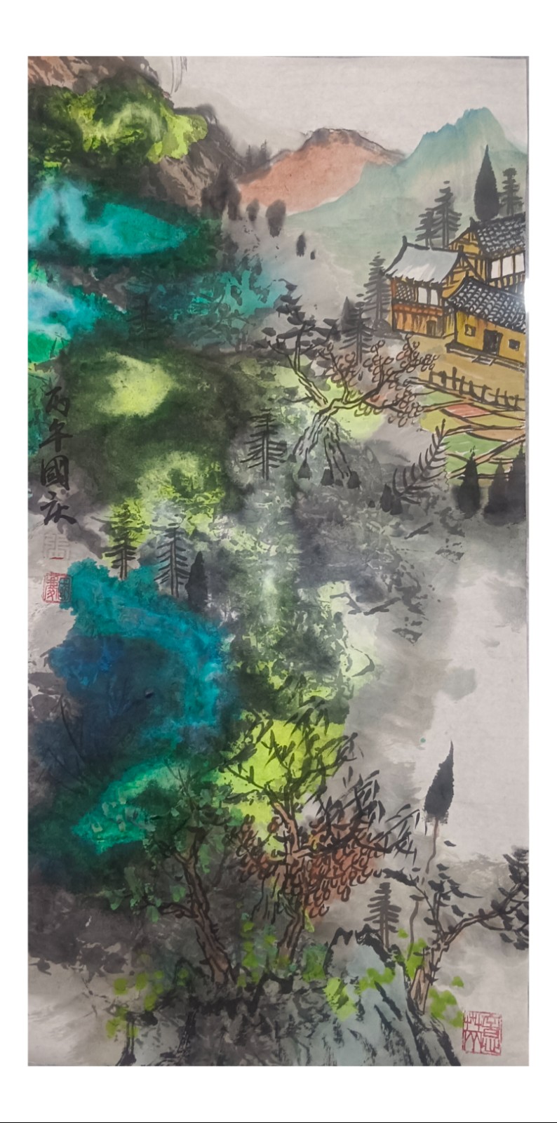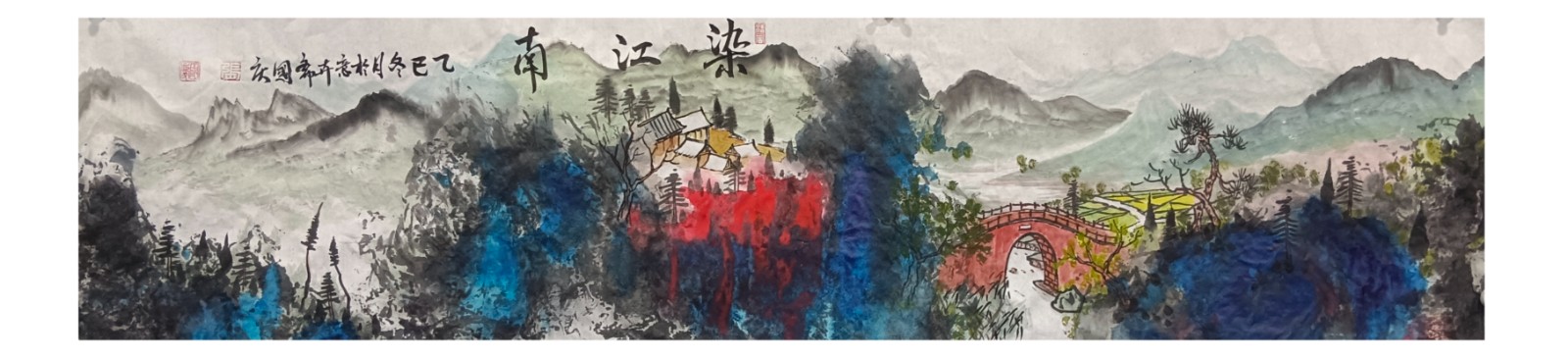 材料与技法的融合:在“赋彩”层面,幻彩山水结合金属颜料、水彩叠加等现代材料,并借鉴色彩构成原理(如色相、明度对比),在保留“色不碍墨,墨不碍色”传统原则的同时,创造出更具透明感、光泽感与视觉张力的色彩语言。