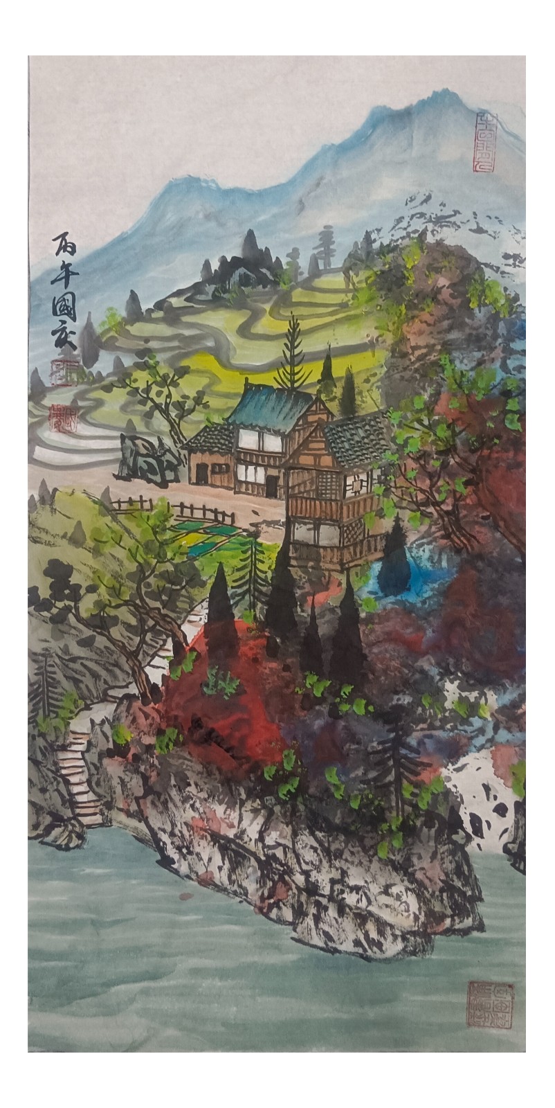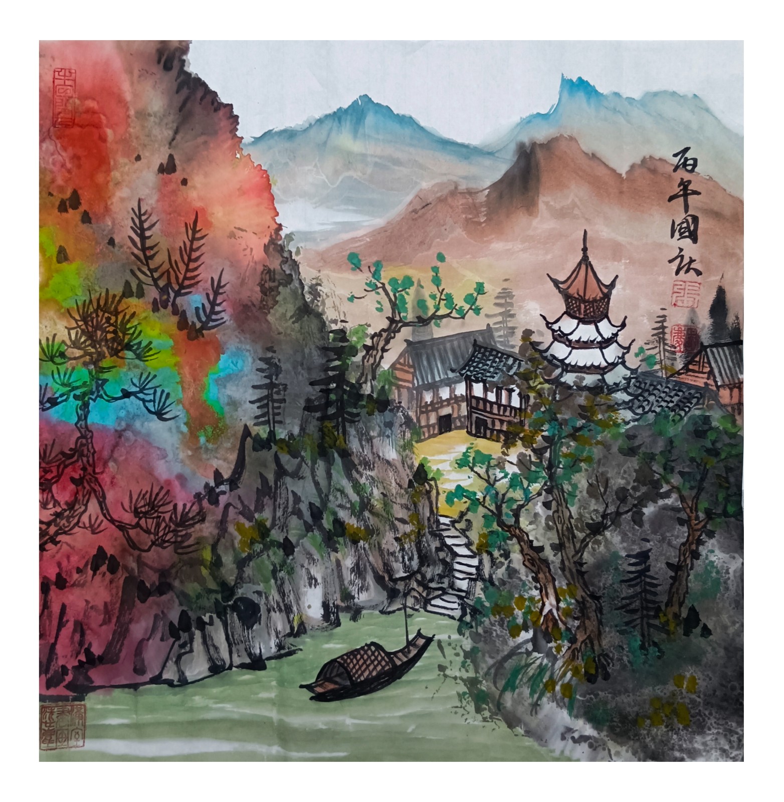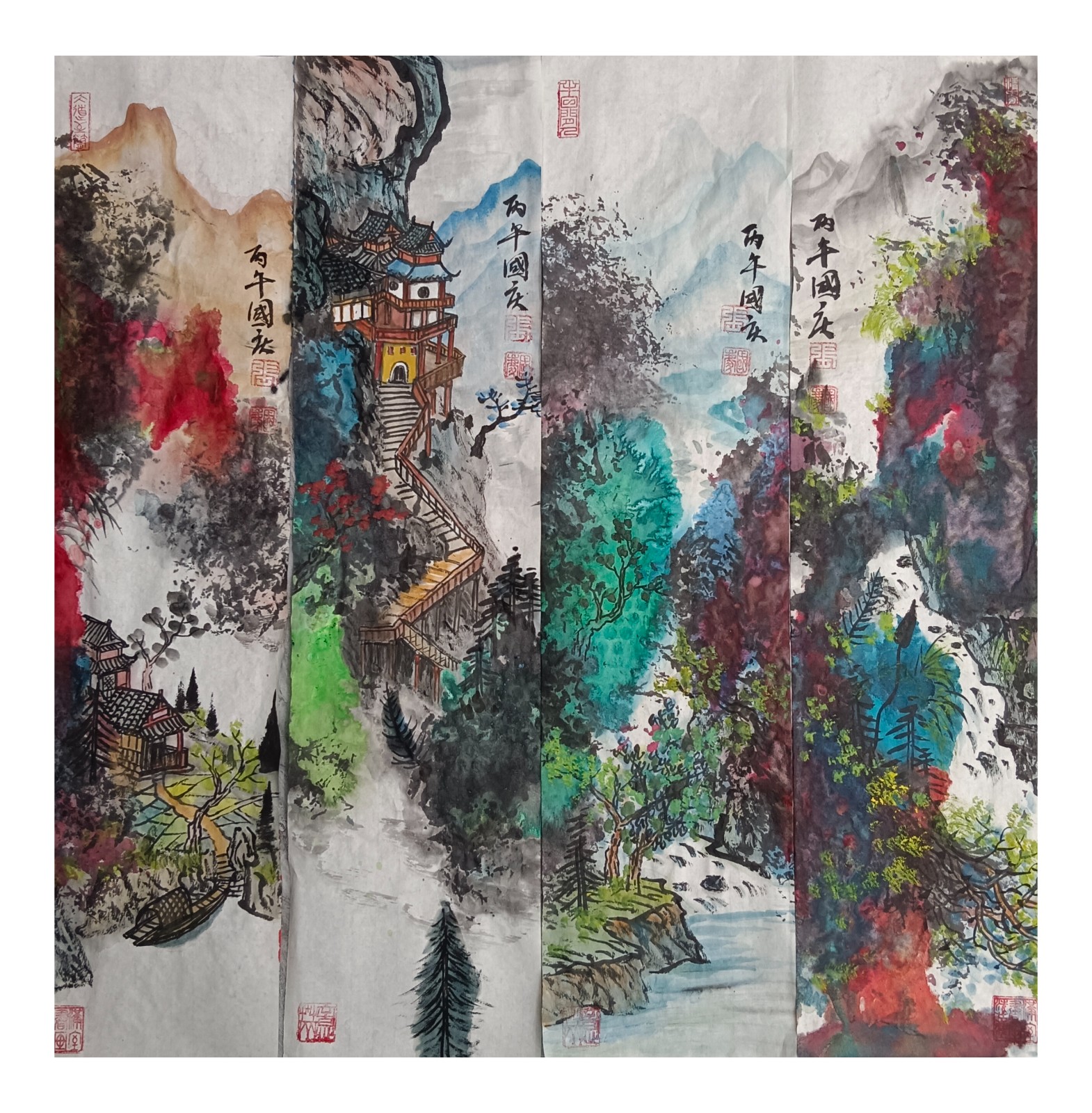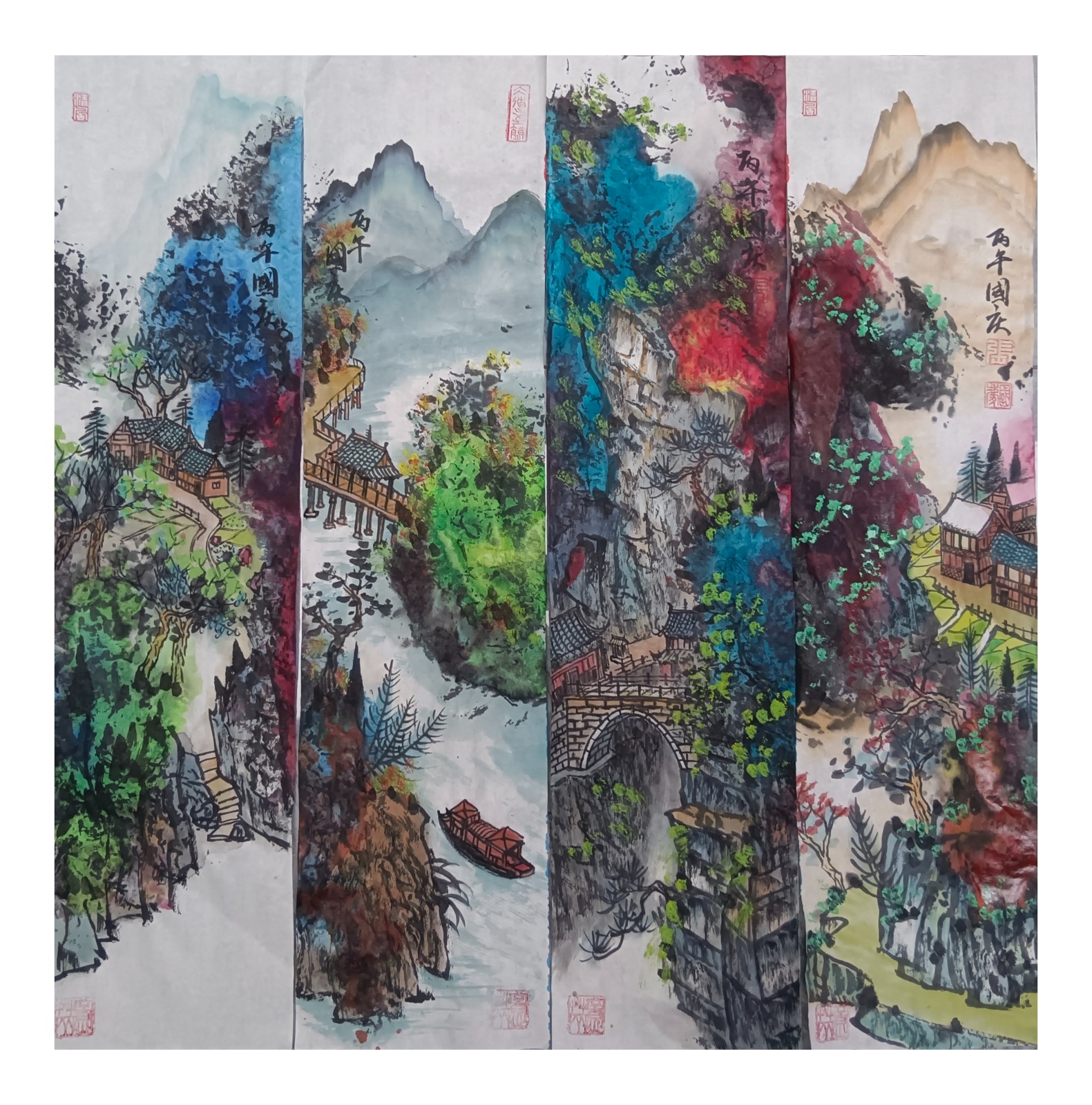 材料与技法的融合:在“赋彩”层面,幻彩山水结合金属颜料、水彩叠加等现代材料,并借鉴色彩构成原理(如色相、明度对比),在保留“色不碍墨,墨不碍色”传统原则的同时,创造出更具透明感、光泽感与视觉张力的色彩语言。