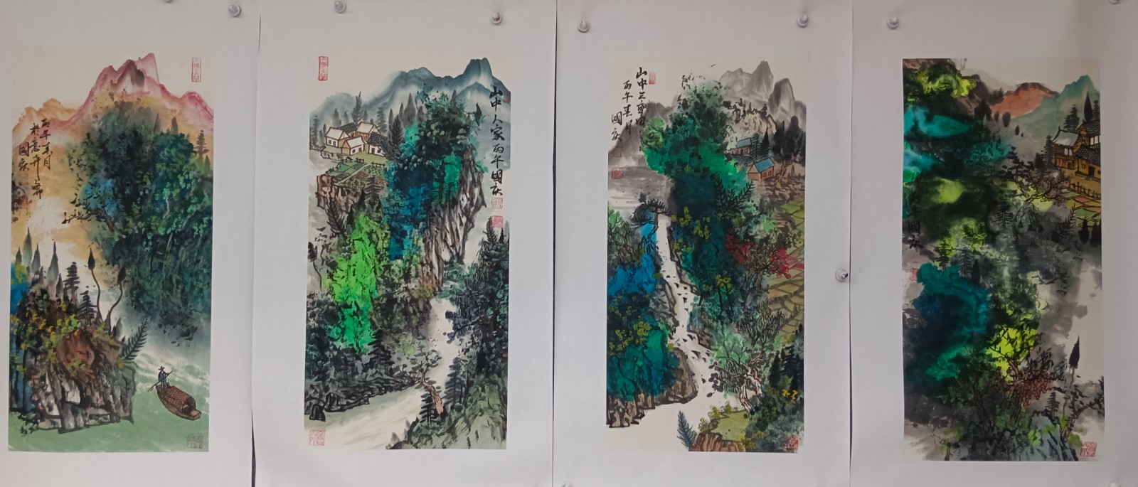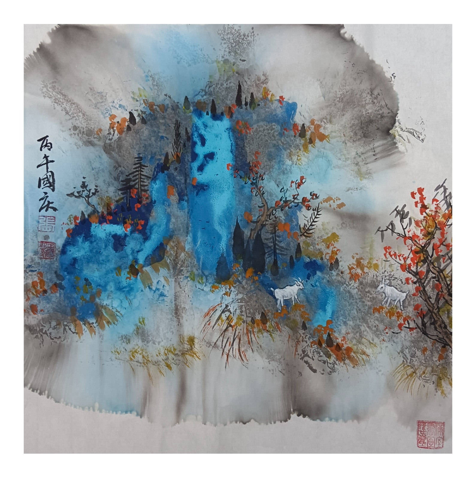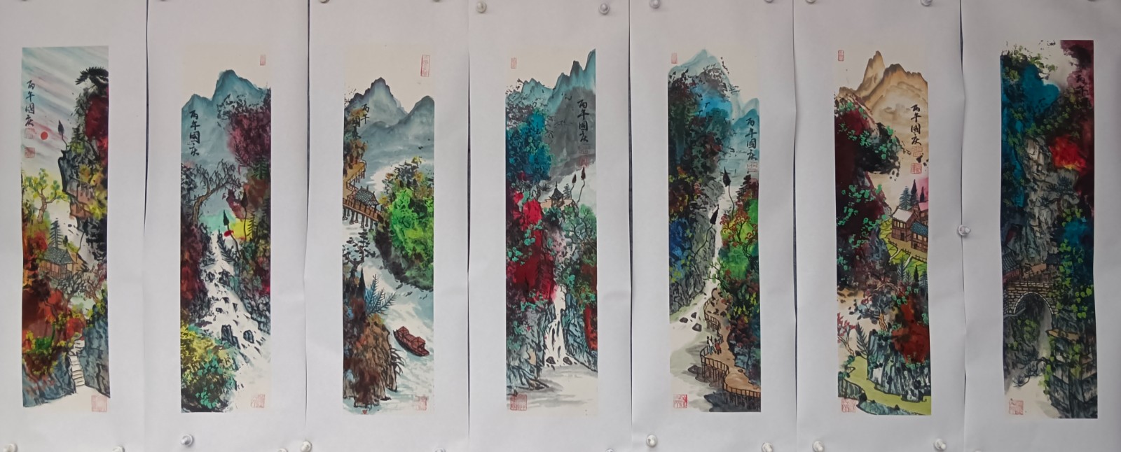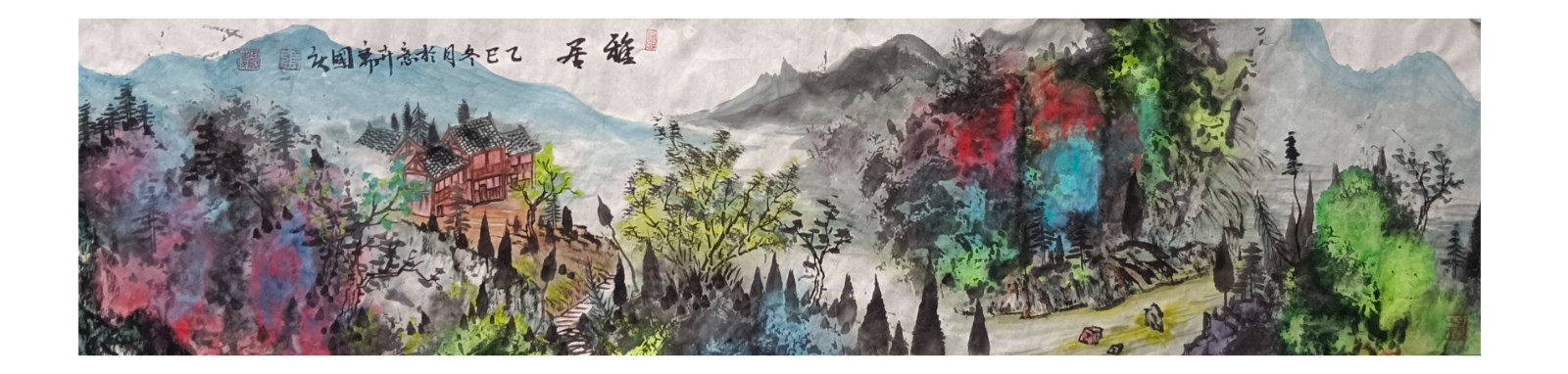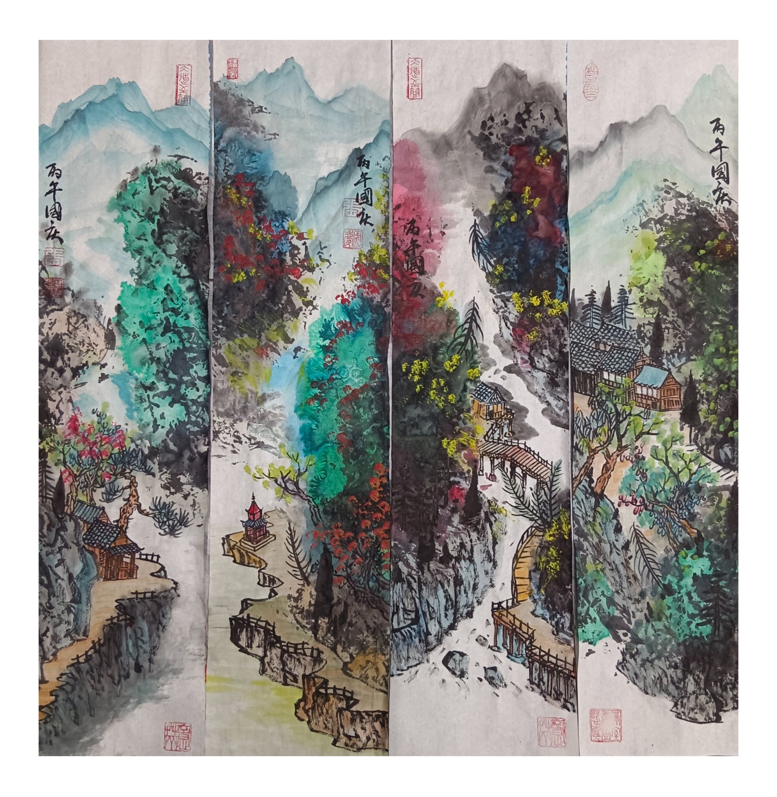 材料与技法的融合:在“赋彩”层面,幻彩山水结合金属颜料、水彩叠加等现代材料,并借鉴色彩构成原理(如色相、明度对比),在保留“色不碍墨,墨不碍色”传统原则的同时,创造出更具透明感、光泽感与视觉张力的色彩语言。
