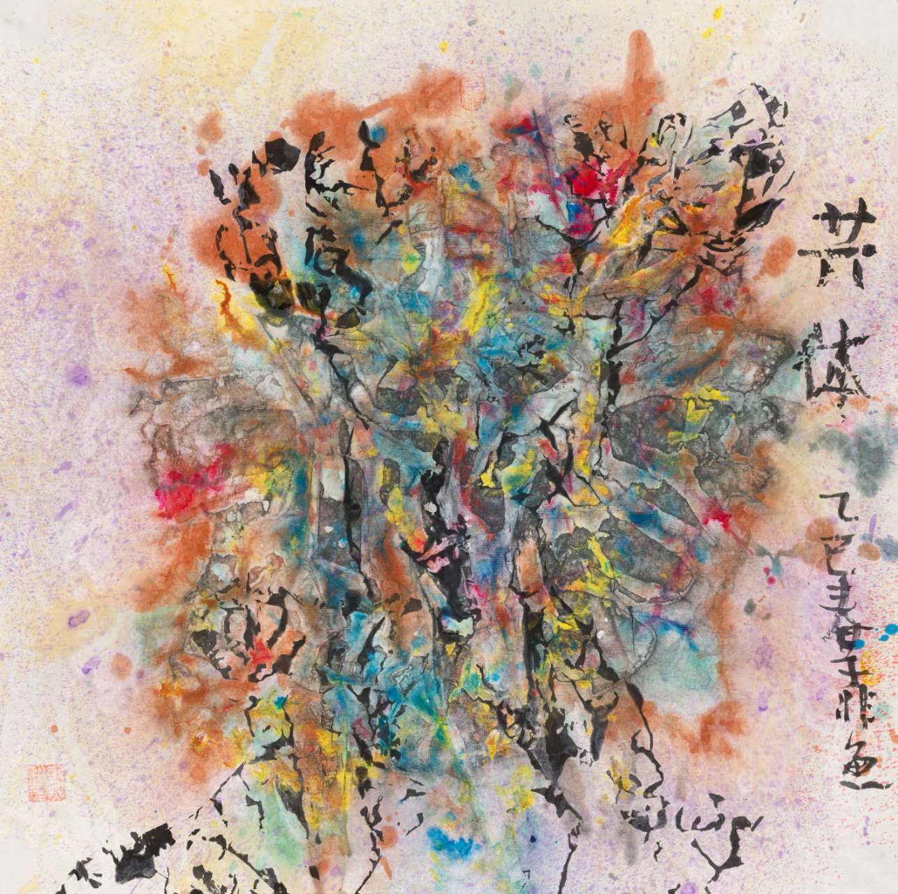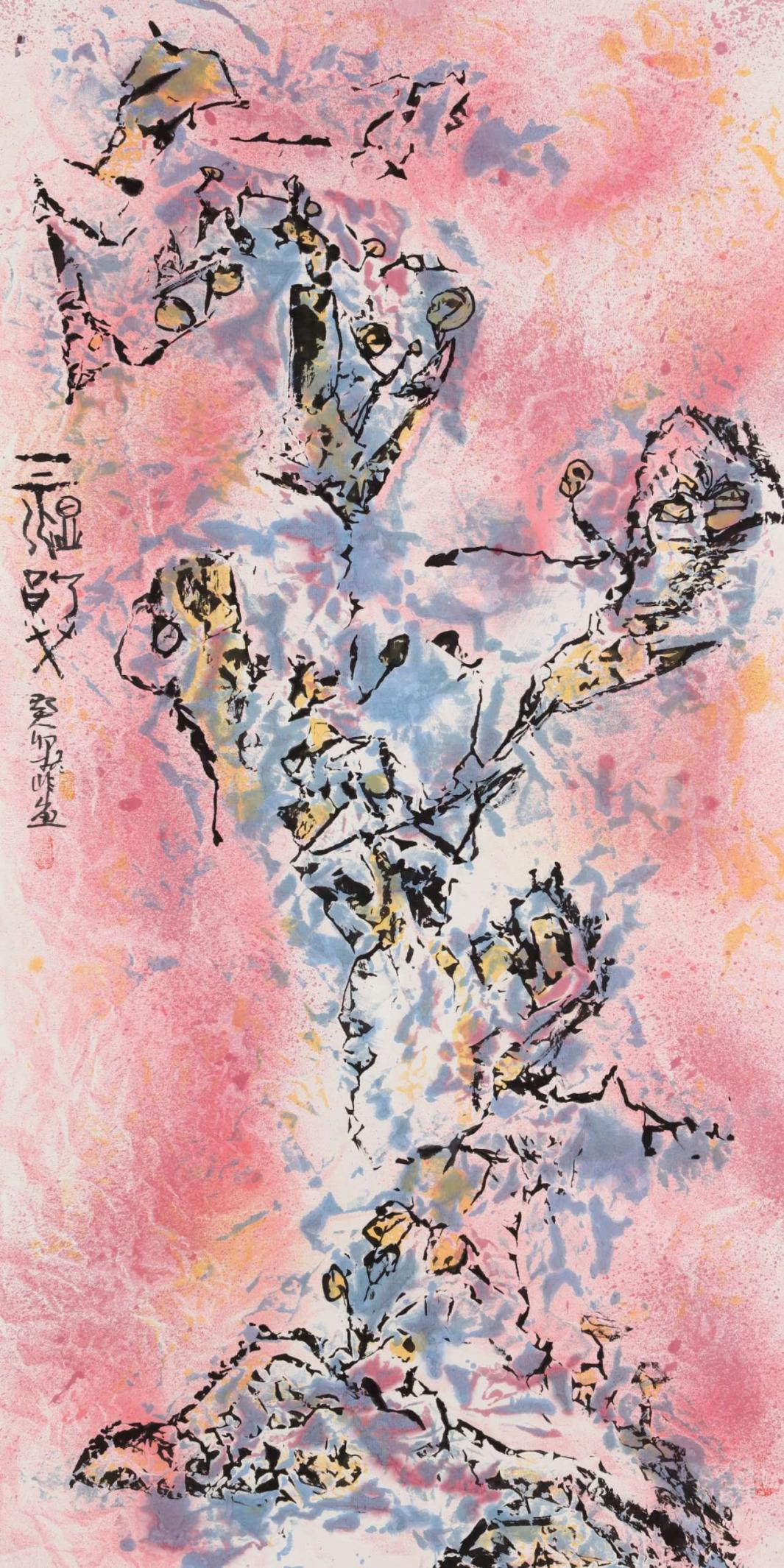 作品以平面化空间打破“三远法”程式,淡紫、粉蓝等现代色彩与焦墨山石形成强烈对比,营造虚实相生、气韵流动的视觉意境。题款文字与画面视觉元素深度呼应,成为构图有机部分,传递道家“万物有道”哲思,将宇宙观引入山水创作,拓展国画精神维度。